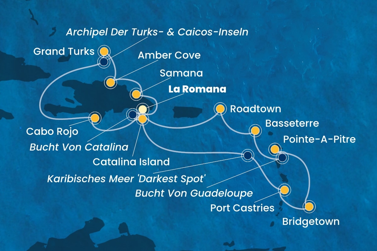 Am 04.Januar 2026 schifften Petra und Ralf in La Romana (Dominikanische Republik) auf der Costa Pacifica zu einer Kreuzfahrt durch die östliche Karibik ein. In der Nacht ging es Richtung St.Lucia.